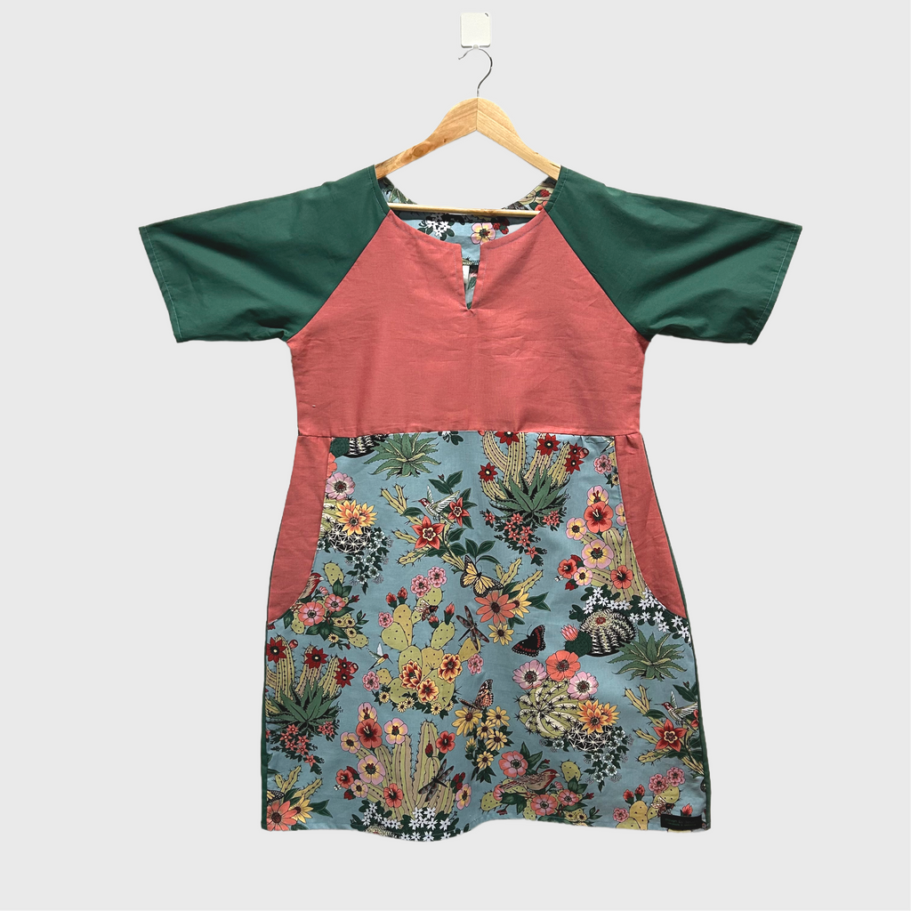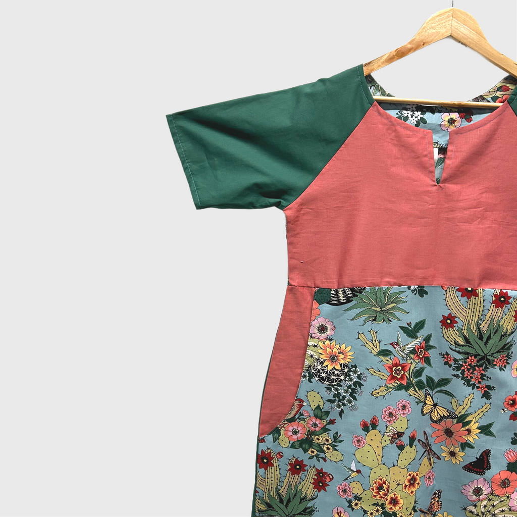 I have used a mix of cottons for this dress blending the feature Alexander Henry cactus print with two solid fabrics. This dress uses my No Waste concept of using as much of my fabric remnant pieces to reduce waste and create unique and long lasting wearable art.
