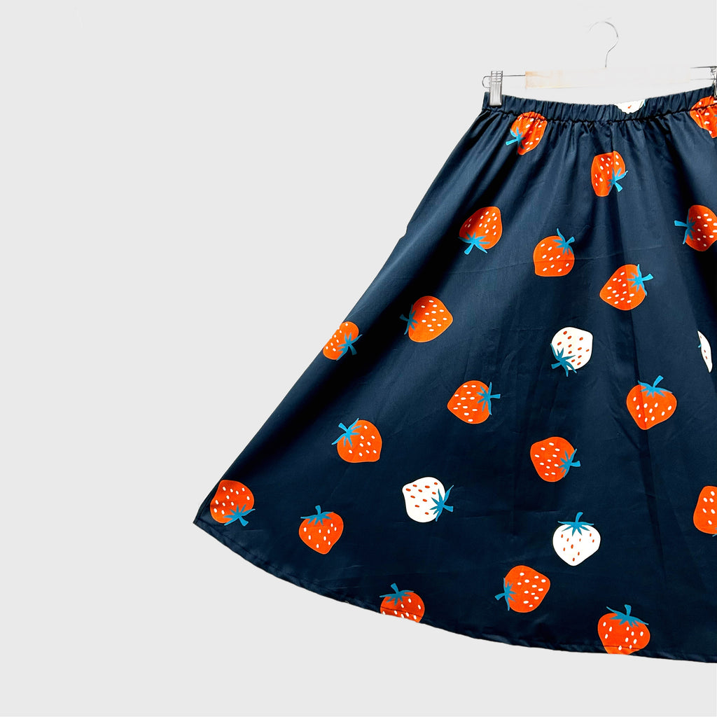 This is a very comfortable, mid-calf length flowing skirt. It is an a-line shape with in seam side pockets and an elasticated waist. The fabric is a stunning cotton by Kimberly Kight for Ruby Star Society. It is a fun strawberry print on navy cotton. The weight of the cotton fabric weight helps with the shape and flow of the skirt.