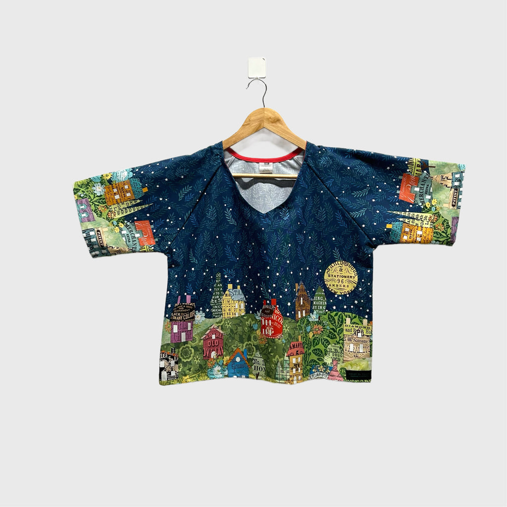 This is a boxy top with a v-neck and elbow-length raglan sleeves. It has a straight hemline and I have added red binding to the inside of the neckline. The fabric is called Paper Hamlet and is a stunning border print by Cathe Holden. This is a sample and has a cropped length.