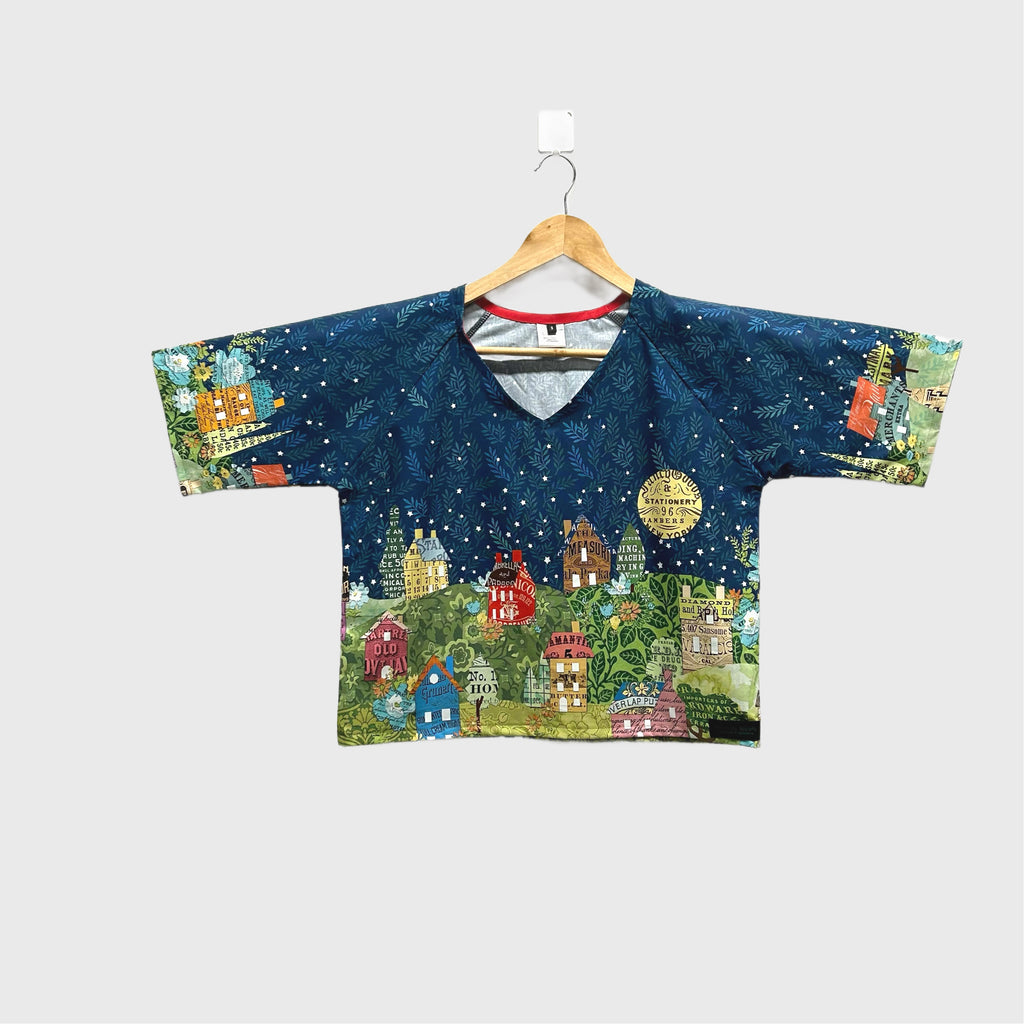 This is a boxy top with a v-neck and elbow-length raglan sleeves. It has a straight hemline and I have added red binding to the inside of the neckline. The fabric is called Paper Hamlet and is a stunning border print by Cathe Holden.